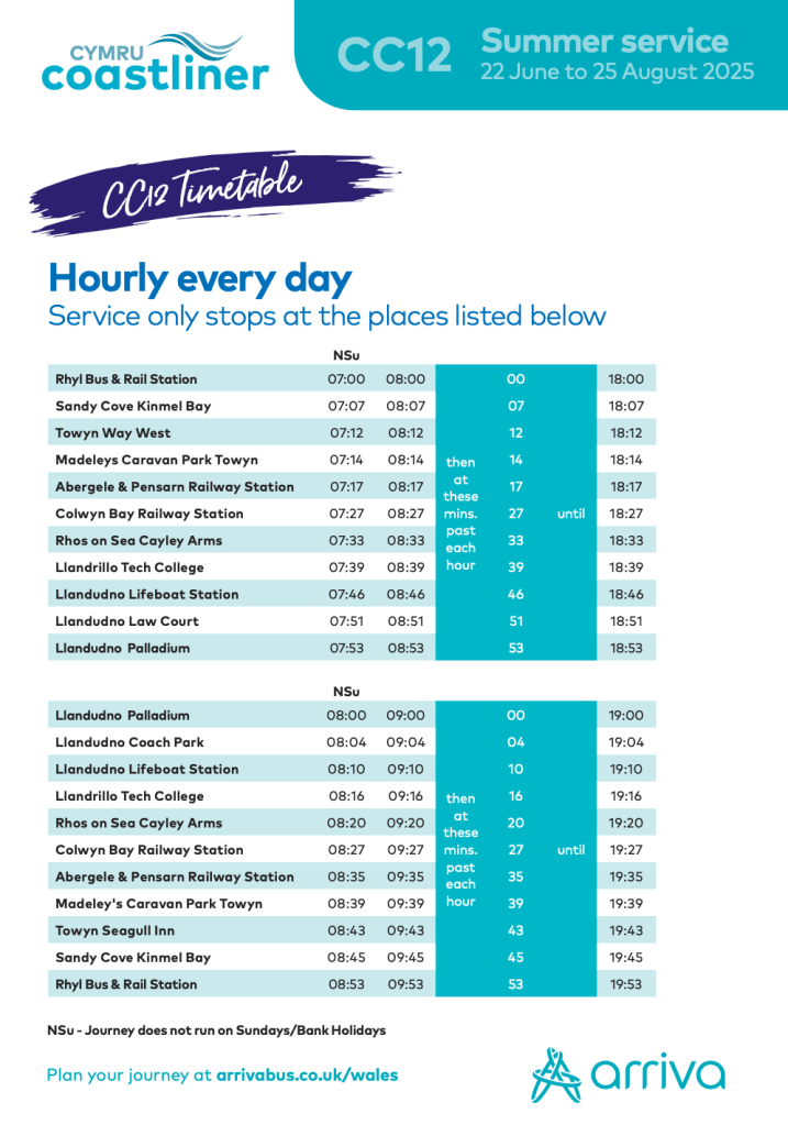 As you can see from the timetable, the CC12 observes just nine stops on its 18 mile route with Towyn and Madeley’s Caravan Park, west of Rhyl, both popular with holidaymakers…