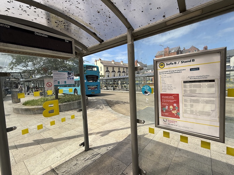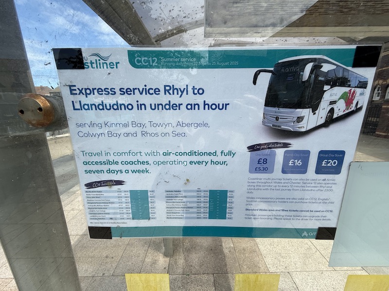 As I got off the coach I noticed the bag for copies of the Metro newspaper had been repurposed as a depository for Arriva’s splendid North Wales promotional booklet and the CC12 timetable leaflet, so helped myself to a copy…