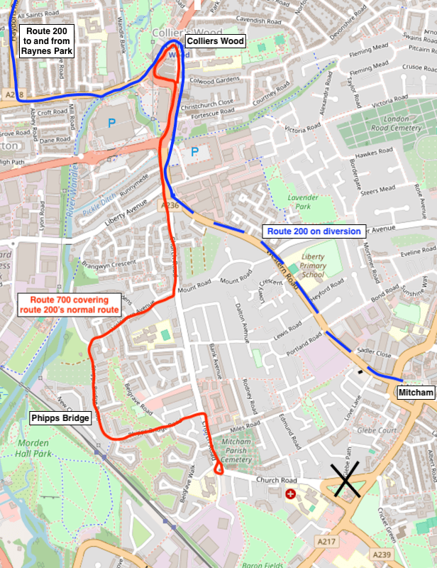 Down in Merton a new temporary bus route has been added to the London bus map (if TfL could be bothered to produce one). Route 700 takes passengers who normally use route 200 between the Phipps Bridge residential estate near Mitcham to Colliers Wood for the Northern line Underground station.