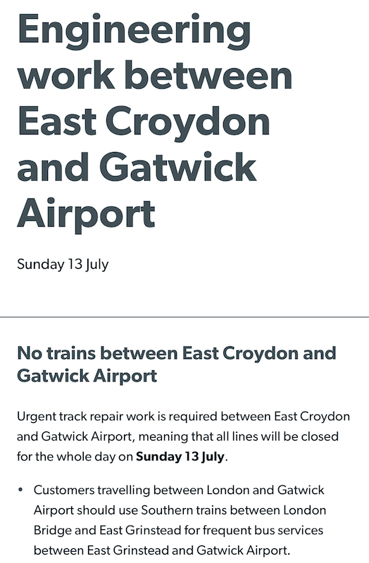 Something very odd happened on the Brighton Main Line earlier this month. A major information campaign was launched to advise passengers urgent repairs to the tracks would close all four lines between East Croydon and Gatwick Airport on Sunday 13th July with no trains running between these two important stations.