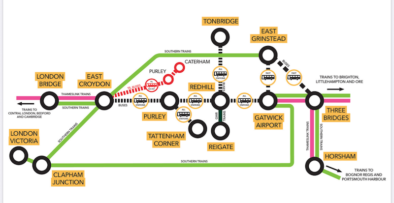 8. If the aborted engineering works were supposed to be at Stoats Nest (where the local, Redhill, line splits from the Quarry line), why were the unconnected branches to Caterham and Tattenham Corner being replaced with buses ? Is this a case of ‘Spread the disruption’ for operational convenience, rather than ‘Minimise the disruption’ to help the greater number of passengers ?