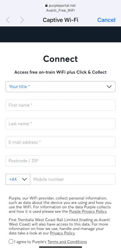 Why do train companies insist on taking unnecessary personal details before allowing you to connect to their on board WiFi? Avanti West Coast’s provider called Purple is one of the annoying ones who even ask for a postcode and your mobile phone number. All so you can use a crap quality WiFi. No thanks. Other train companies let you register once and then it hopefully recognises your email address once you enter it correctly.
