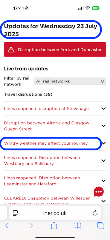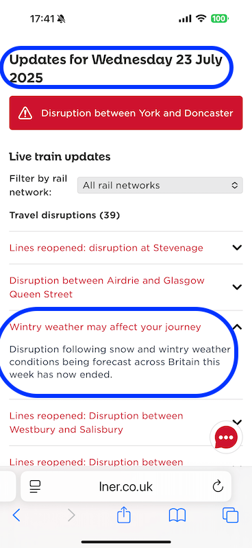 But, most confusing of all was LNER’s website which decided to list 39 cases of disruption across the whole rail network but the catch being they were from earlier this year including a warning of “Wintry weather may affect your journey”