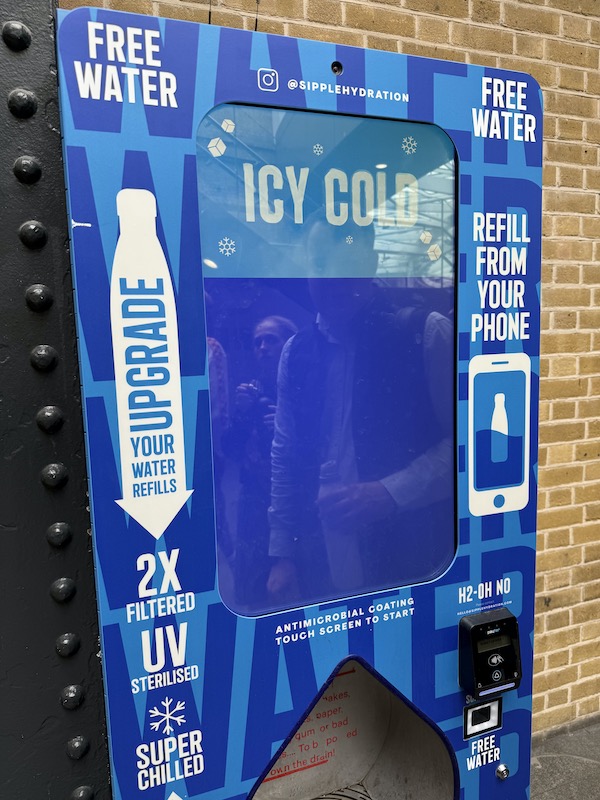 Over at the supposed “free” water bottle filling station at King’s Cross (and also being installed elsewhere) I watched passengers trying to work out the complicated routine of how to actually access the “free vend” water…