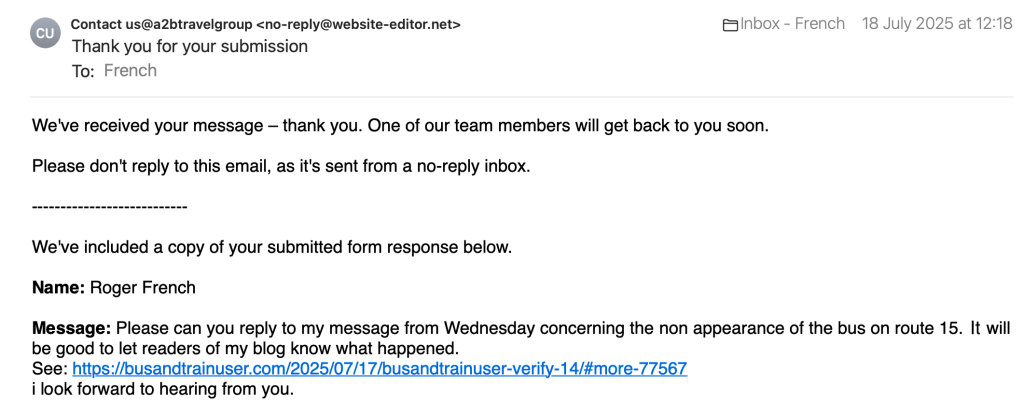 4. At least A2B’s automated response includes your original webform enquiry at the bottom. So many other companies and local authorities fail to do this, even when responding substantively, making me seethe with annoyance. Webforms are inconvenient enough (especially those which give insufficient options in their drop-down lists, or worse still fail to give an ‘Other’ option (I actually find this patronising, as if there can’t possibly be any other reason for me to contact them)), without having to make one’s own note of the content for later reference when a response is received, especially when one has sent more than one webform (eg reporting two street hazards to a highway authority).