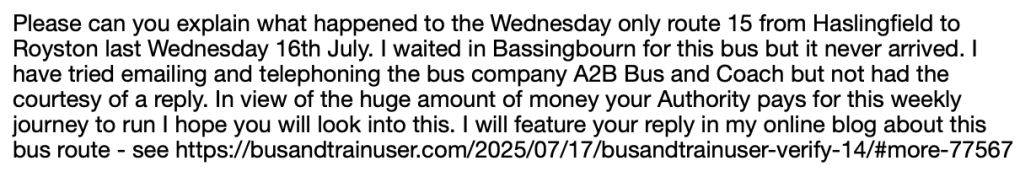 Another follow up to a recent blog is to let readers know despite sending a follow up email to A2B enquiring about the whereabouts of the missing journey on the £360 per subsidised passenger Wednesday only route 15 to Royston on 16th July (see above acknowledgment) no reply or explanation has been received. I’ve also phoned the company five times but each time the “team are all busy” and the line goes to answerphone. In such circumstances the obvious thing to do was to make contact to Peterborough and Cambridgeshire Combined Authority to let them know…