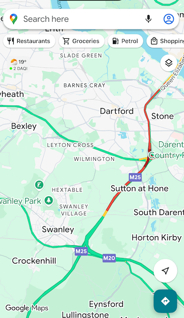 However, Google maps was also showing a long red line emanating south from Dartford on the M25 indicating heavy congestion approaching the Tunnels.