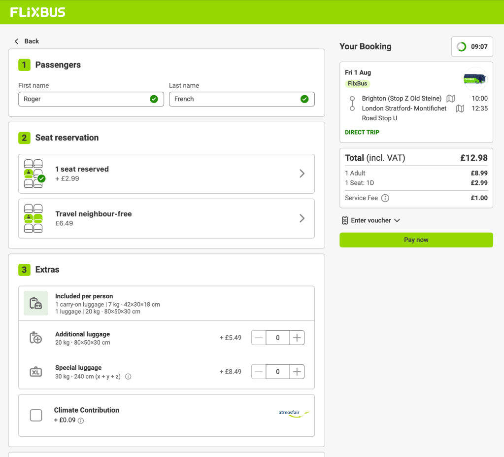 I think the booking fee is unavoidable on Flixbus (National Express waive theirs if you register and login to their website) but I discovered (it wasn’t clear when booking) that it is possible to avoid a seat fee if you allow Flixbus to allocate the seat for you. I hate booking a seat on a coach, as I always like to choose a suitable one on boarding – I’m glad that National Express largely don’t book specific seats (and hope it stays this way) – so with Flixbus I cheekily ignore my seat number and just sit somewhere, and hope that nobody gets on and is booked in the seat I’m in. I do of course move if someone says they are booked in my seat. So it’s a case of crossing one’s fingers until the likely last boarding stop has been passed (Southampton University or Heathrow T5) then being able to relax.