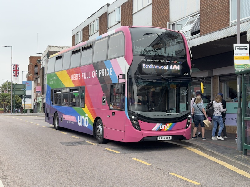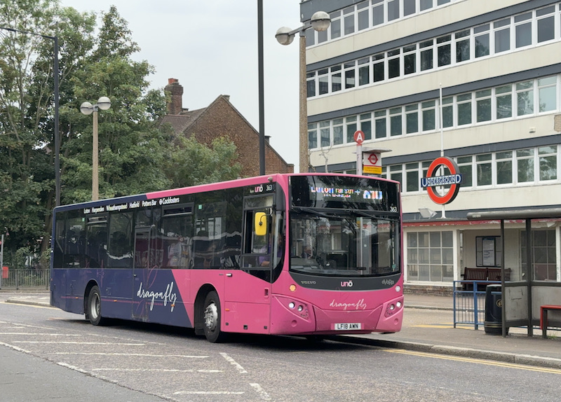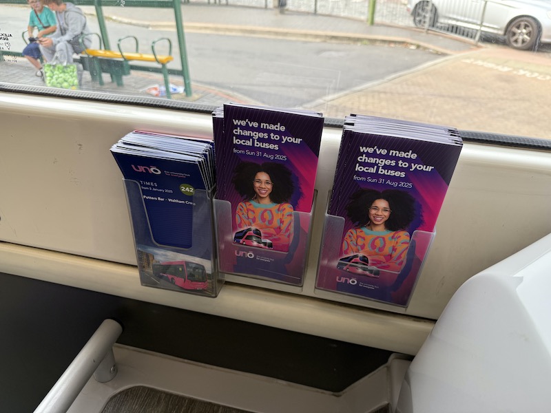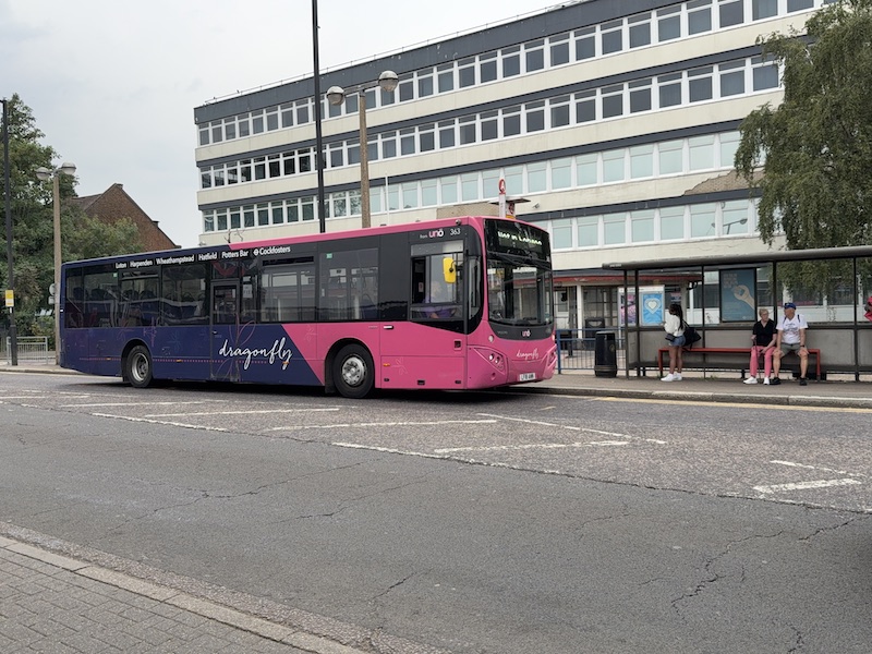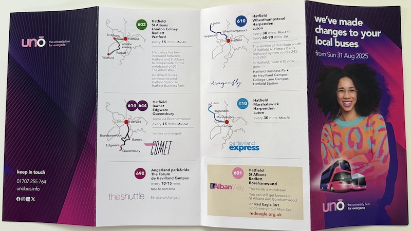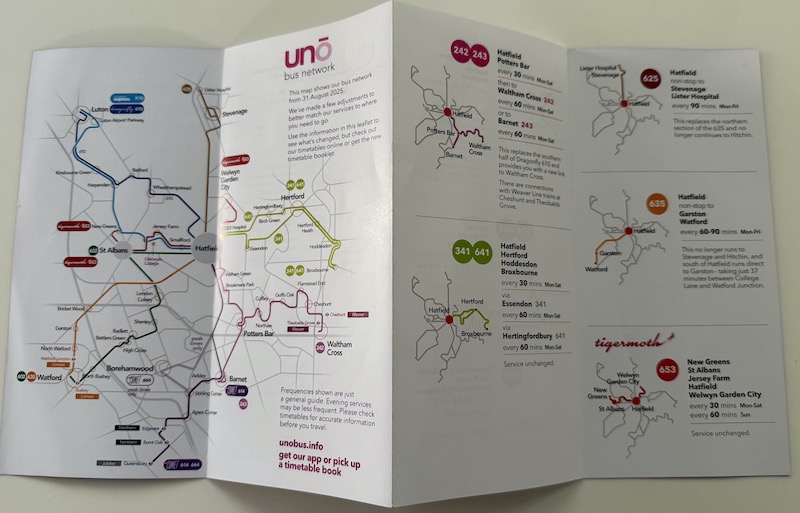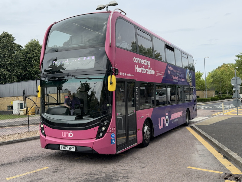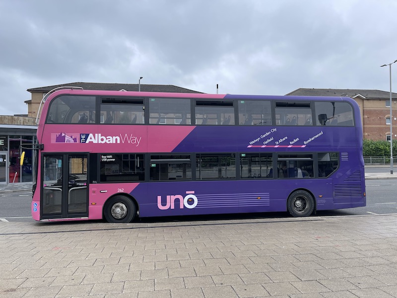 The Enfield section was ditched some time ago and now the route is being cut back to only run north of the University of Hertfordshire’s campuses in Hatfield to Luton via Wheathamstead and Harpenden. South of Hatfield the route through Welham Green and Brookmans Park as far as Potters Bar will be covered by two newly extended other routes (more of which later) and south of Potters Bar to Cockfosters passengers continue to have the 20-minute frequency TfL route 298, also now operated by uno. But the through route from Cockfosters to Hatfield and Luton will be no more.
