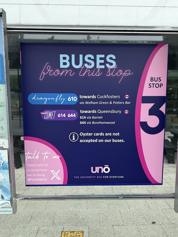 We caught the 11:40 from Cockfosters as far as the University’s extensive set up at The Forum where there’s a busy bus station particularly in term time but even in holiday time earlier this month it was noticeable there were quite a few passengers around. Passengers boarded throughout the route even from Cockfosters to travel to Potters Bar despite it being a non TfL route so Oyster, 60+ Freedom Passes and the £1.75 flat fare are not applicable.