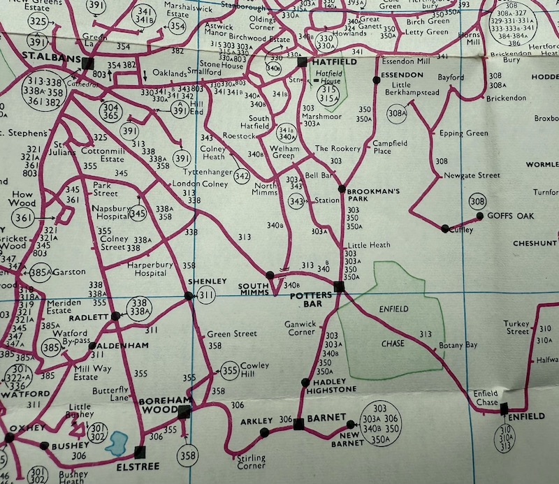 I took a ride in the section of route from St Albans south to Borehamwood and we carried 17 passengers. It more or less follows the old London Transport route 355 south of St Albans (as shown on the earlier vintage map).