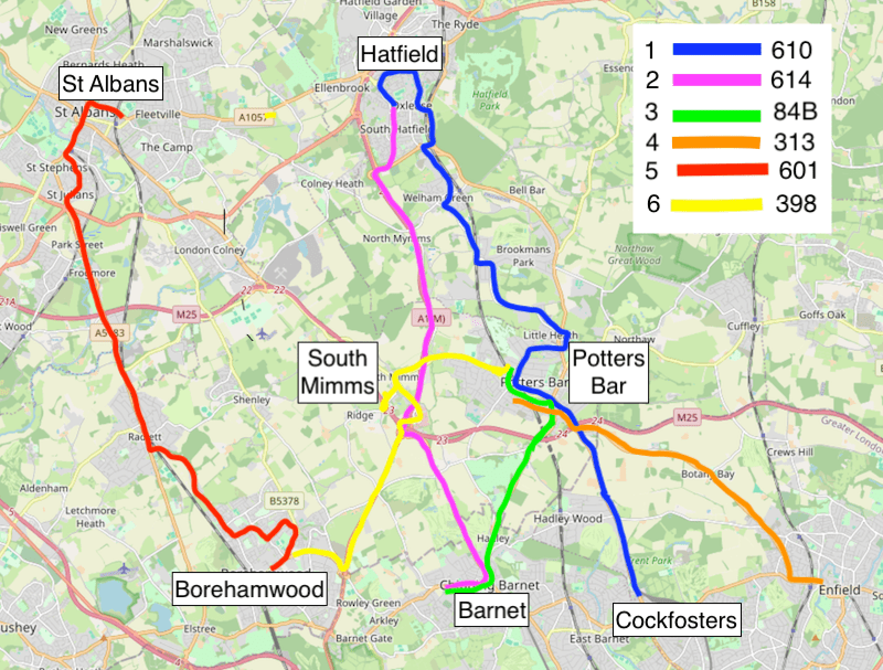 Interestingly in London Transport days the section of route between Borehamwood and South Mimms on the A1 was served by just one peak hour journey on the 29 (northbound morning and southbound evening) which went as far south as Turnpike Lane. Victoria would have been a bit of a stretch even in those pre 1968 long LT route days.