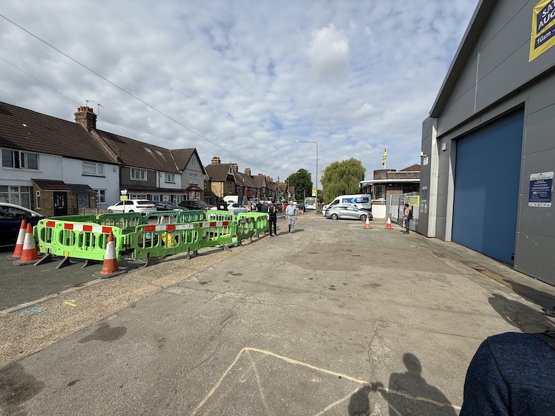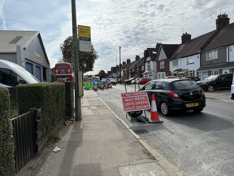 … saw three way temporary traffic lights causing long tail backs either side of the garage.