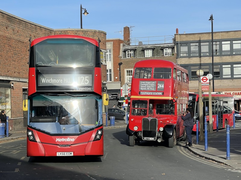 The 244 ran every 15 minutes whereas today’s equivalent route 125 runs every 10 minutes. So not only would I enjoy free travel to school but 50% more buses on the first leg of my journey. And today it would be on a smart First Bus electric Enviro400EV City based at Edgware garage whereas 60 years ago it was an RT from the long closed Muswell Hill garage.