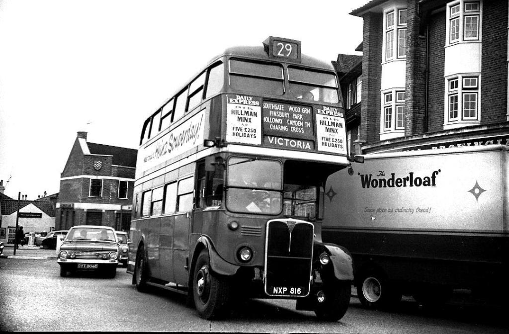 A bus on route 29 picks up on Southgate Circus opposite the Underground Station. Photo credit: Colin Stannard via Barry Le Jeune with thanks