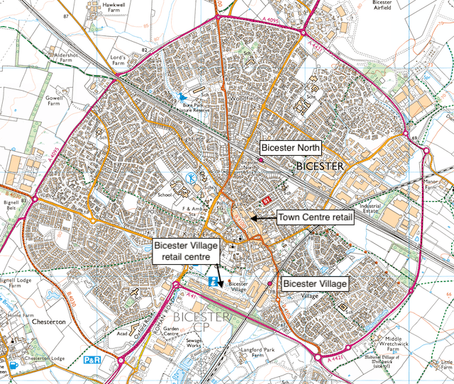 You can see from the above map how Bicester is surrounded by a series of A roads with its two stations once again almost on the same line of longitude with Bicester North being fairly centrally located about equi-distance from the town centre as Bicester Village in the south, next to the outlet retail centre.