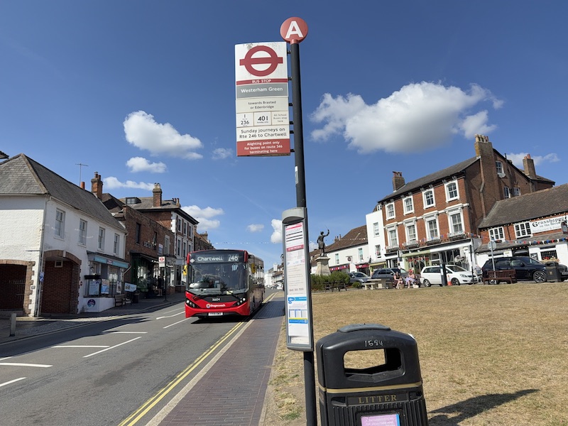 As it’s the easiest, my first try out was TfL’s route 246. I only travelled from Westerham Green, which is always a pleasant place to wait for a bus, especially on a warm sunny Sunday lunch time, and caught the third departure of the day at 12:11, which had left Bromley at 11:23. There are five more departures each hour until 17:18.