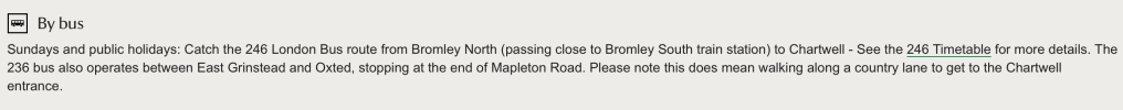And that’s how you visit Chartwell House by bus, but be sure to know what day of the week it is. And when route 246 ceases its Sunday extension for the winter period.