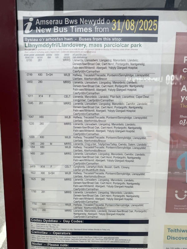 At least over in neighbouring Carmarthenshire an up to date departure listing was displayed at Llandovery bus stand, so well done to them.