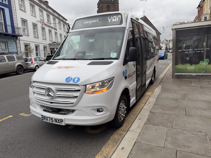 It was a great journey along a very quiet Saturday early morning A40 to Llandovery and back and as you can see from the above photo at Llancovery, was operated by a brand new Mercedes Sprinter. Not surprisingly, no-one travelled out but two passengers did board in Trecastle coming back both being delighted to have a bus service once again. From Sennybidge (about midway along the route) passengers have had long standing route T6 from Swansea for many years which, running hourly, means the X80 isn’t the novelty it is west of Sennybridge.