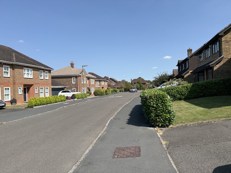 11. There is another access to Epsom Downs station, although I’m not surprised that you missed it. A footpath heads south-east from the London end of the platform to emerge anonymously between two houses on Ruden Way. The only indication that it’s there is a small and easily-missed sign attached to a lamppost on the opposite side of the road.
