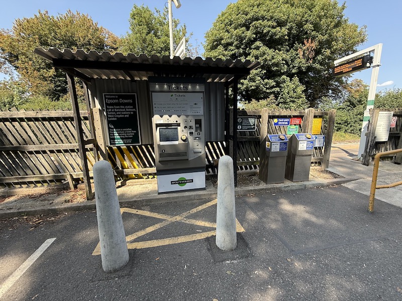 There’s quite a contrast between Epsom’s centrally located four platform station (above) which sees both terminating and through trains operated by two train companies (Southern and South Western Railway) and the one platform unstaffed terminus at the end of a single track branch line over at Epsom Downs.