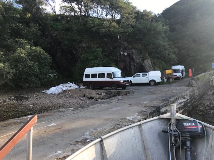 We’d passed John’s daughter about four miles from the jetty along the track, where she can just pick up a mobile signal, so was spending the afternoon online shopping on the back seat of her car!
