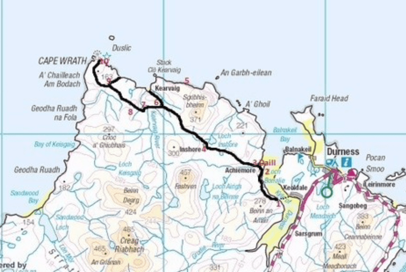 The map below shows the context of the remote area between the A838, the Kyle of Durness and Cape Wrath.