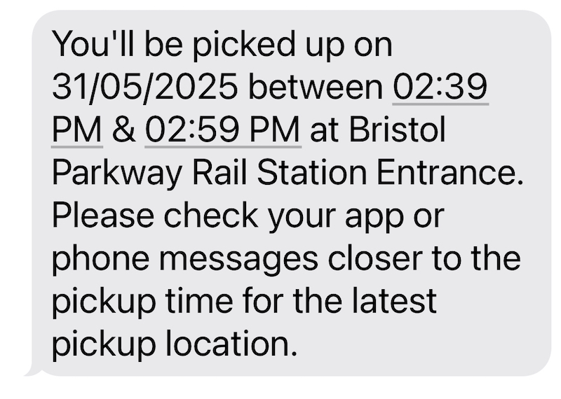 But then, as you can see above, a further text came through eight minutes later at 13:57 advising “you’ll be picked up in 5 minutes”. Yikes that’s 14:02 – two minutes before my train arrival, all the more so as we were approaching Bristol Parkway by then and an inevitable unexpected early deceleration and I guessed we’d be arriving slightly late.