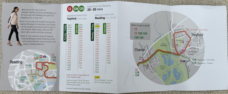 New half hourly route 12 only runs in the off-peak utilising two buses otherwise committed to school journeys in Reading at peak times on routes 91 and 92 so it’s one of those additional routes being run at the margin of costs (assuming fixed costs are priced into the school journeys). The timetable runs later in the afternoons on Saturdays and there’s no service on Sundays.