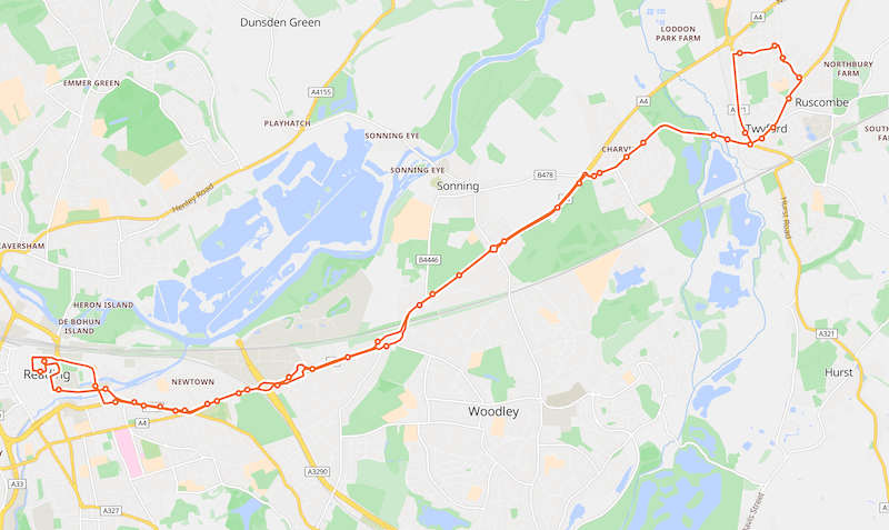 I travelled on the 12:07 departure from Reading thinking there might be shoppers going home for lunch. The bus arrived from its inbound journey at 12:04 with eight passengers alighting but there were no other takers to head back to Twyford nor did any join on the journey.
