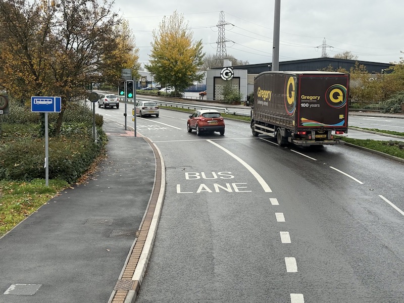 … there’s a very handy section of bus lane so buses don’t need to use the roundabout (interestingly it’s not depicted on the above photographed road sign)…