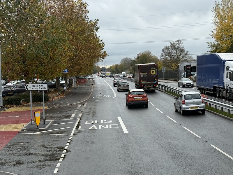 …before continuing south to the junction with Rose KIln Lane where the bus lane now goes right up to the traffic lights (having let the left turning traffic through) as well as through the junction itself, as highlighted in the news stories…