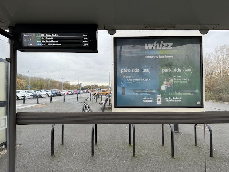 That signage still showing the Madejski Park & Ride would indicate that Reading suffers from the near universal issue of highway authorities not updating their signage. One of my big frustrations around the local bus network in Leicester is that 15 years after they opened neither of the large north & south Park & Ride sites are signposted from any of the trunk roads including the motorway (the south site being close to the main M1/M69 junction) but instead car drivers are still signposted to the small western site at Meynells Gorse which is very difficult to find and access from the motorway in either direction.