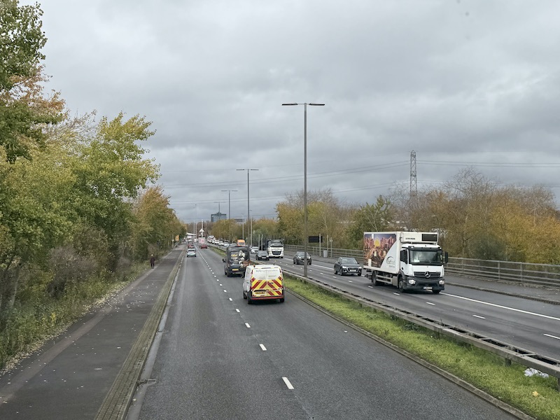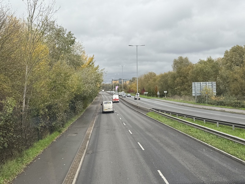 The bus lane now continues beyond the junction passing the newly installed 53 tonne pedestrian and cycle bridge alongside the opposite inbound carriageway…