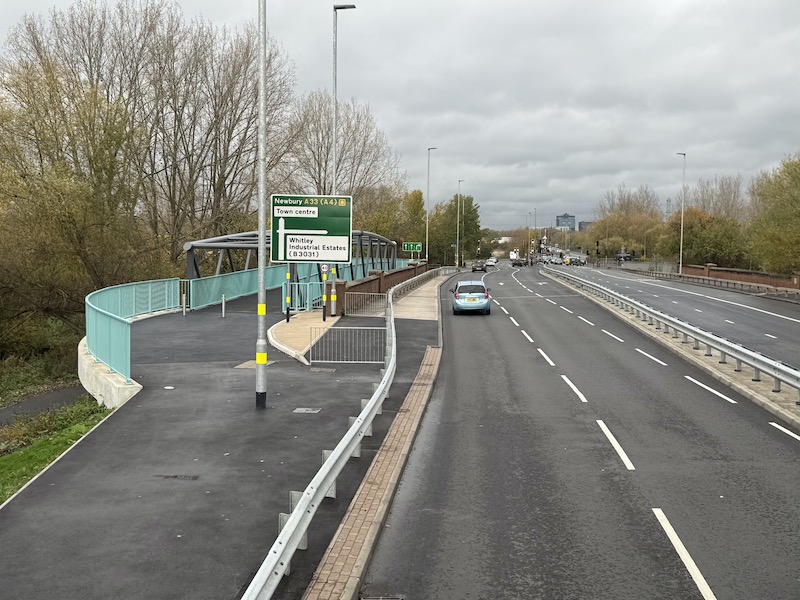 It’s a two lane dual carriageway making it possible for one of the lanes to be given over to buses with the scheme beginning way back in 2016 when the first priority measures were introduced. This fifth phase, which has just completed, has seen bus lanes to the north and south of Rose Kiln Lane joined up as well as additional bus stops for Matalan and other retail stores. The high profile installation of a new pedestrian and cycle bridge over the River Kennet completed the phase.