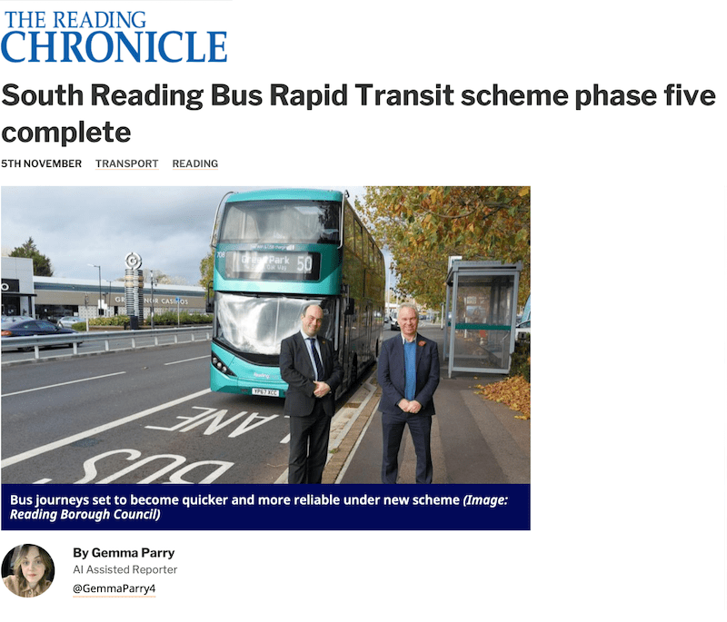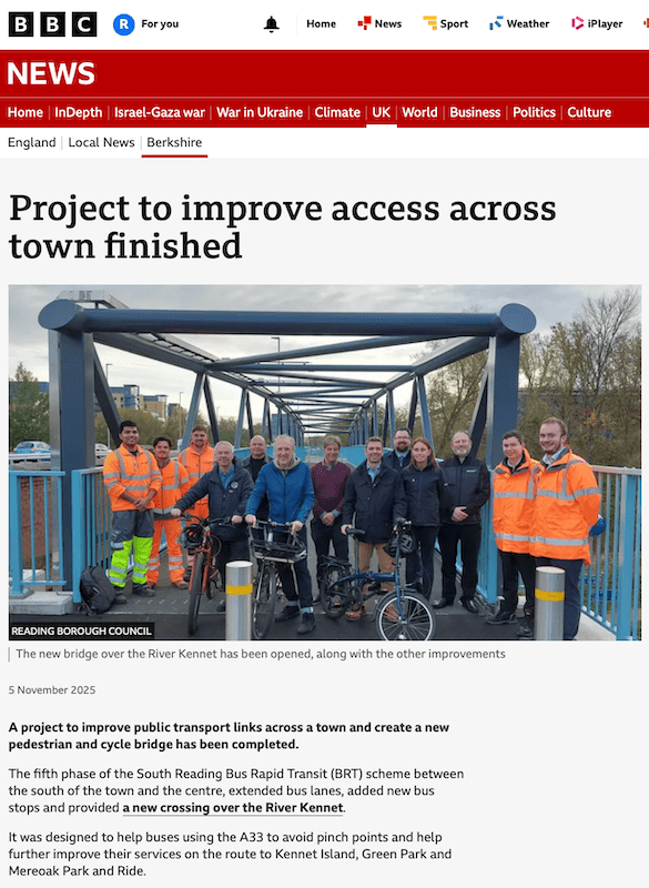 The Reading Chronicle carried a report by ‘AI Assisted Reporter’ Gemma Parry headed up with an official Reading Borough Council photo of Reading Buses CEO Robert Williams along with Councillor John Ennis, Lead Councillor for Climate Strategy and Transport, in front of a smart looking bus on a section of the bus lane while the BBC featured a new pedestrian and cycle bridge which has reportedly “created space for a bus lane without removing any carriageway from general traffic”.