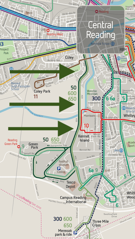 The section of A33 involved in the scheme is a kind of by-pass built some years ago to the west of the original A33 Basingstoke Road (now served by route 6 as shown in the above map) and is used by route 50 which serves the Green Park Business Park area every 15 minutes (10 minutes in the peaks) and route 600 (650 on Sundays) which serves the Mereoak Park and Ride (15 minutely) with alternate journeys continuing to either Riseley or Thames Valley Science Park via Spencers Wood and Shinfield. That’s 10 buses an hour in the peaks and eight in the off-peak using this section of the A33.