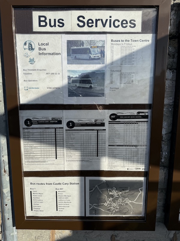 Noting that South West Coaches currently provides two bus routes serving Castle Cary station – route 1 between Yeovil and Shepton Mallet and route 667 between Wincanton and Street, both running two-hourly, I thought I’d take a ride over to Castle Cary and try and get an idea of the potential for this proposed new service.