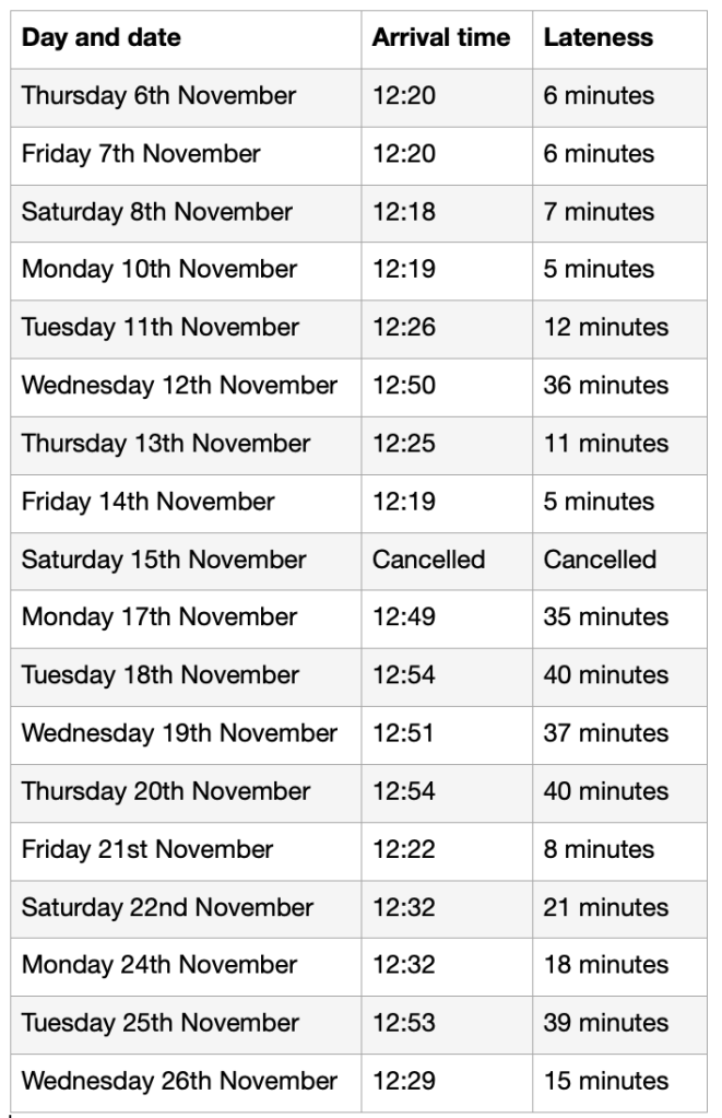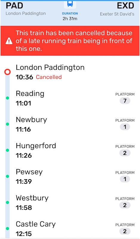 However my confidence was shattered when checking recent actual train arrival times at Castle Cary showing in the two weeks prior to my intended travel date (last Thursday, 20th November) the train (10:36 from Paddington to Exeter St David’s) hadn’t arrived on time on any day during that period.