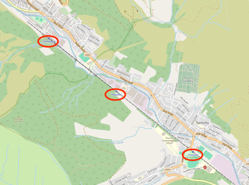 The distance between these last three stations is quite small (0.8 miles Treorchy to Ynyswen and 1.8 miles from Ynyswen to Treherbert) but it was felt best to lay on a bespoke replacement bus service with any passengers living close to Ynyswen station being ferried less than a mile to Treorchy to connect with trains towards Cardiff, as well as providing a facility from Ynyswen to Treherbert, even though three buses an hour operate between the two locations.