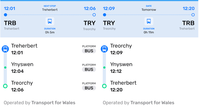 Southbound journey time from Treherbert to Ynyswen is three minutes and two minutes on to Treorchy with northbound journeys given three minutes back to Ynyswen and eight minutes on to Treorchy.