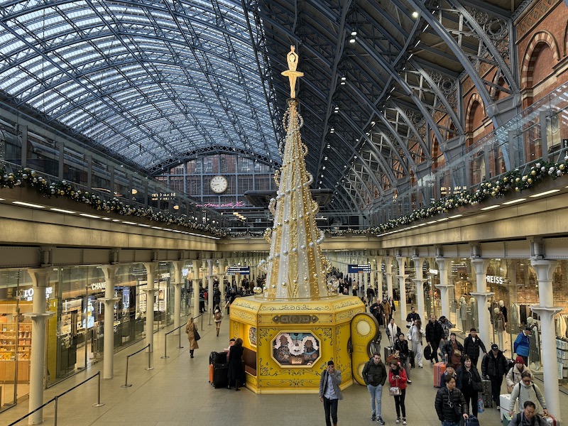 AI tells me “the 2025 St Pancras Christmas tree, themed “Powered by Dreams”, represents the hopes, dreams, and resilience of children at Great Ormond Street Hospital (GOSH), styled as a magical, rotating music box to bring their aspirations (like becoming a pilot or gymnast) to life through art, music, and accessible features like Braille. It’s a collaboration with GOSH Charity to raise awareness and funds, showcasing the station’s musical heritage and the power of imagination.”