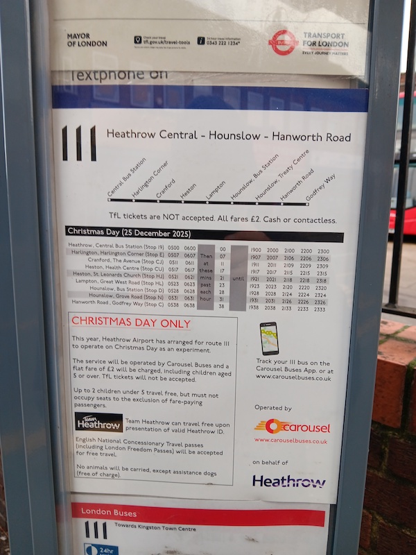 carousel’s Christmas Day service on route 111 was commissioned by Heathrow airport to enable workers to commute. Many airlines still run normal timetables on Christmas Day. ~ Andrew Saffrey