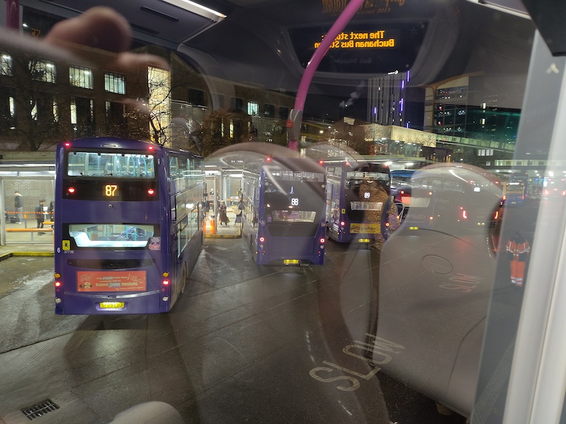 Jo also added “on a totally unrelated point – other than I observed this on the same trip – the very comprehensive electronic information display at Buchanan Bus Station showed a Flixbus 091 departure to “Terminal” (next to the Stranraer departure I was looking for). Checking bustimes.org showed this to be the 1400 ex Aberdeen that is the 1735 service from the bus station, extended to Glasgow Airport Terminal Building (Stance 10). As I am sure you would agree, “Terminal” is absolutely meaningless by itself. There are many examples of this sort of duff information, across the UK, where the wrong part of the destination field is extracted. This may be understandable in itself. What is less understandable – but very common still – is that no one picks this nonsense up, or, if they do, nothing is done to correct it. Incorrect or misleading, information is often worse than none at all. You or I could point this example out to Transport Scotland (or other responsible body) for correction, but why is someone at TS or similar not spotting this sort of thing and dealing with it? All the best for 2026.”
