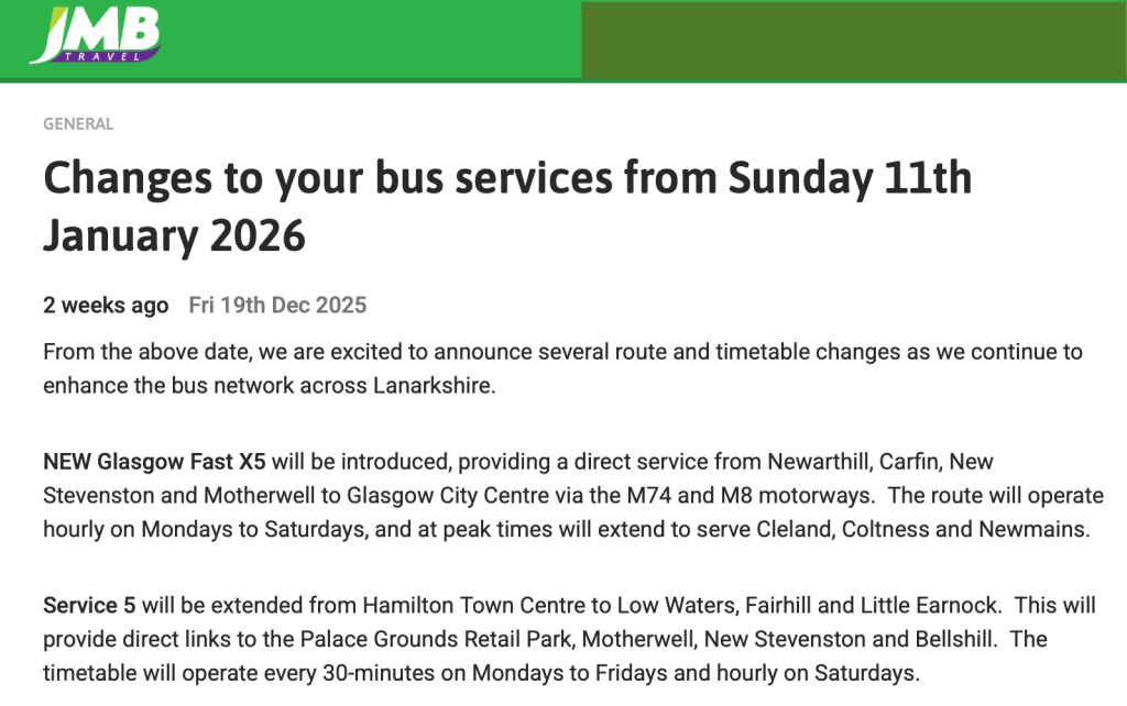 And on another positive note Bryan emailed with good news about JMB Travel letting me know it’s “expanding their network and coverage yet again on 11th January. The changes are: (a) a new “Glasgow Fast” route from Newarthill, Carfin and Motherwell to Glasgow. This will compete locally with First’s service 254; to me, Newarthill and Carfin are poorly served by First and (b) An extension of service 5 from Hamilton Town Centre to Fairhill and Little Earnock. This will compete with First services 226 & 228. JMB Travel took over service 5 from Ballantynes when it only ran between Bellshill and Motherwell. JMB then extended the route to Hamilton Town Centre and it is now to get further extended in Hamilton. There are also some timetable improvements.” Thanks Bryan, it sounds like another trip to Glasgow in the next few weeks is on the cards to check that out.