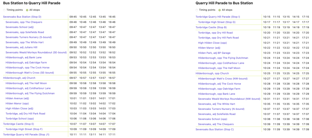 Arriva’s timetable comprises a half hourly frequency in the off-peak generally at 23/53 from Sevenoaks and 22/52 back from Tonbridge. Interestingly, aside from a journey at 07:13 from Sevenoaks the next departure is at 08:51. Similarly from Tonbridge the first northbound journey is at 07:15 then nothing until 08:35 and 09:12. So, not particularly helpful for commuters and school children. The go-bus incursion doesn’t add anything to plug these gaps either.