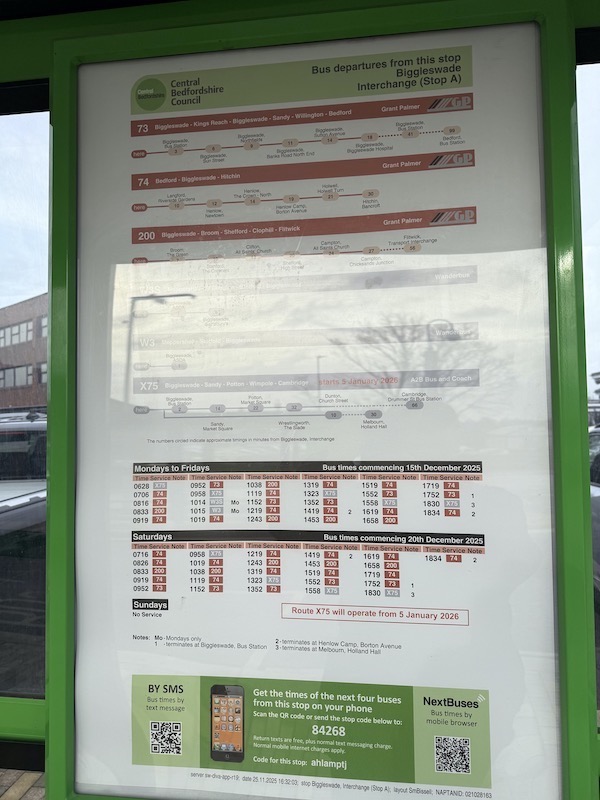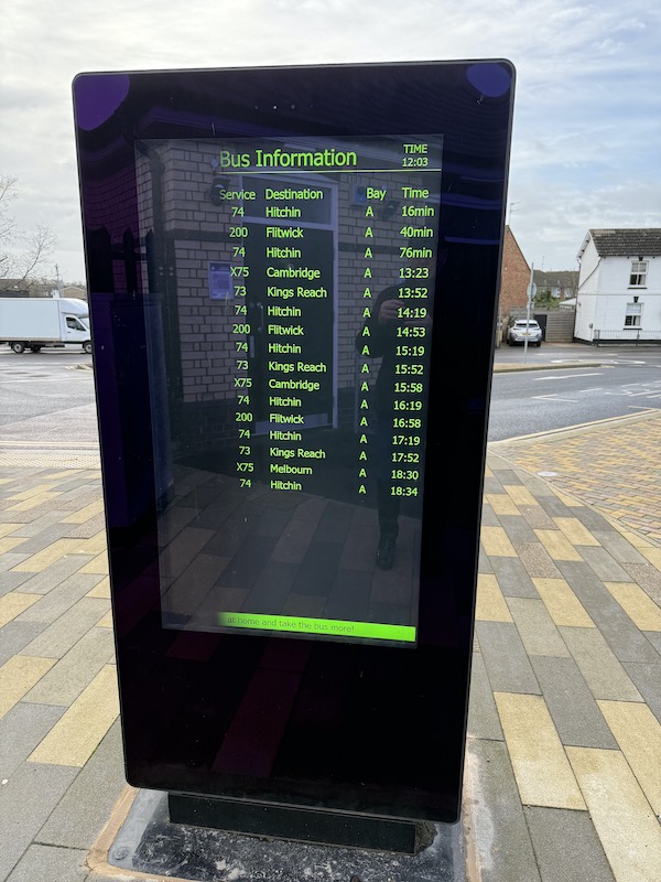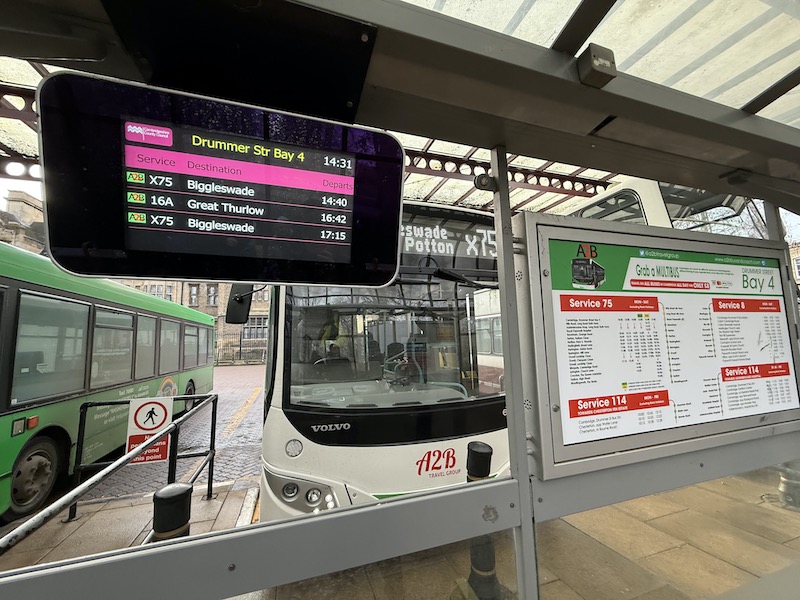 Well done to Paul’s friend for distributing publicity about the service although I didn’t spot any timetables in Cambridge’s Drummer Street bus station but it was good to see it listed on the electronic departure displays as it was at Biggleswade Interchange too…
