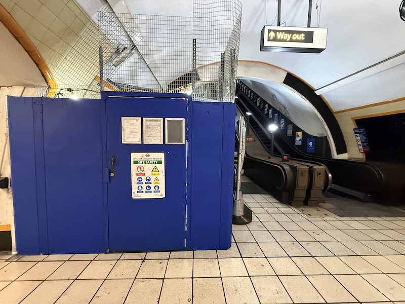 This has closed off one of the escalators allowing the other one to continue to operate in an upwards direction and thereby keep the station open but as exit only.