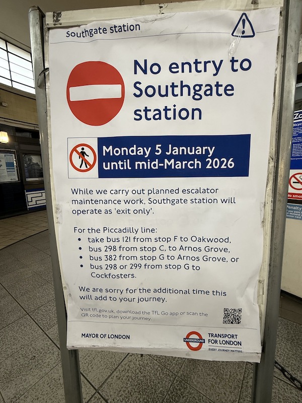 There’s been a fair bit of consternation in my old home patch of north London since the New Year when TfL closed Southgate Underground station for entry to access the Piccadilly line until mid March to allow for maintenance of the escalators.
